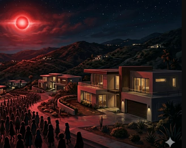 Yes, Nic, we had finished dinner and I was showing our guest around because we had our house built the previous year and it was his first visit. It’s not large but it has a great view of the city below, it’s kinda a square stucco built partially into the hill in a small neighborhood. I was in the second floor living room by my desk and saw light coming through the aluminum blinds – but it was red light. The aluminum blinds are on a timer and had closed for the day but the light was just getting through the gaps. I just scrunched them apart, you know, to look out where the red glow was coming from.