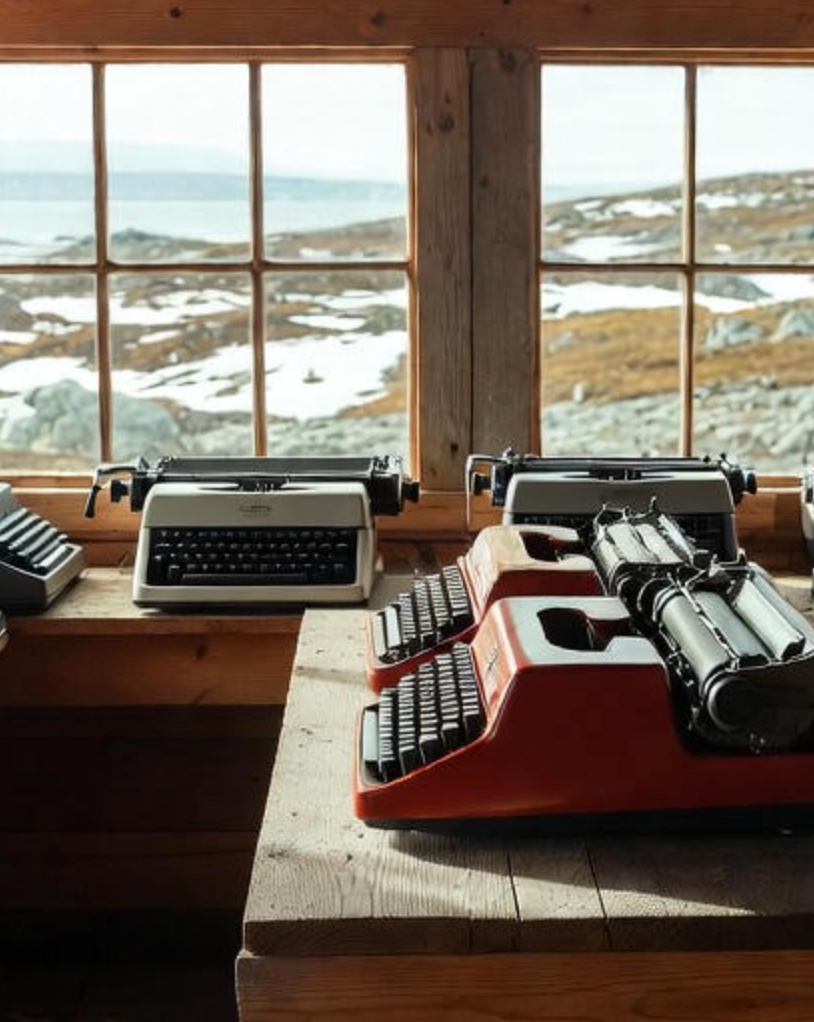 A robust table was closest to us and around on it were six electric type writers. Three matched and were the same type, a couple were similar but different and one was red.