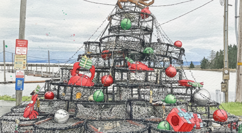 The whole square was packed because it was the crab-pot-Christmas-tree lighting ceremony with the choir, the local business leaders and everyone in the town gathering. There were candied apples for sale at a booth and the city building had a little craft-fair / rummage sale.
